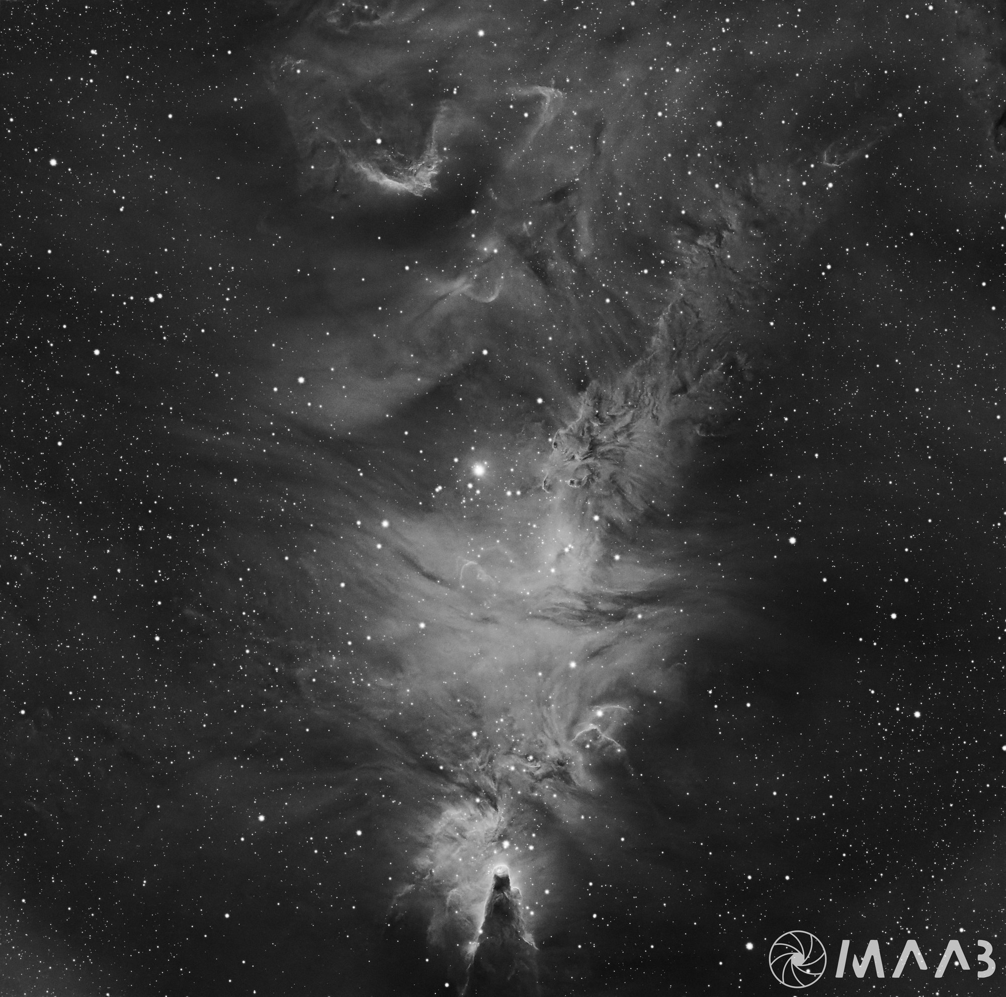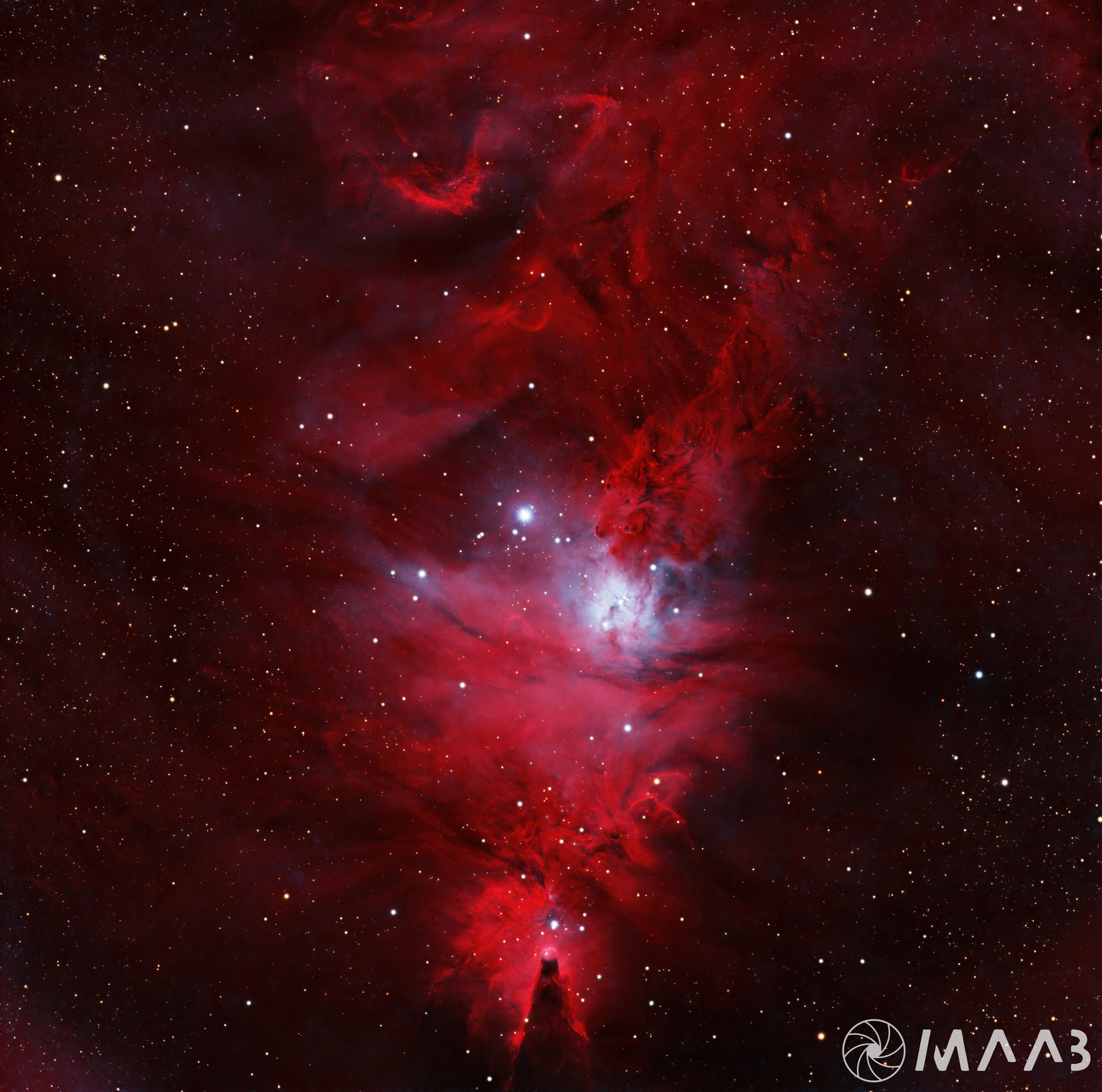 - Der Konusnebel (Cone Nebula): Am unteren Rand der Aufnahme (an der „Spitze“ des Weihnachtsbaums) befindet sich diese dunkle, kegelförmige Struktur. Es handelt sich um eine dichte Dunkelwolke aus Gas und Staub, die das Licht dahinterliegender Objekte schluckt und durch Sternwinde massereicher Sterne geformt wurde.