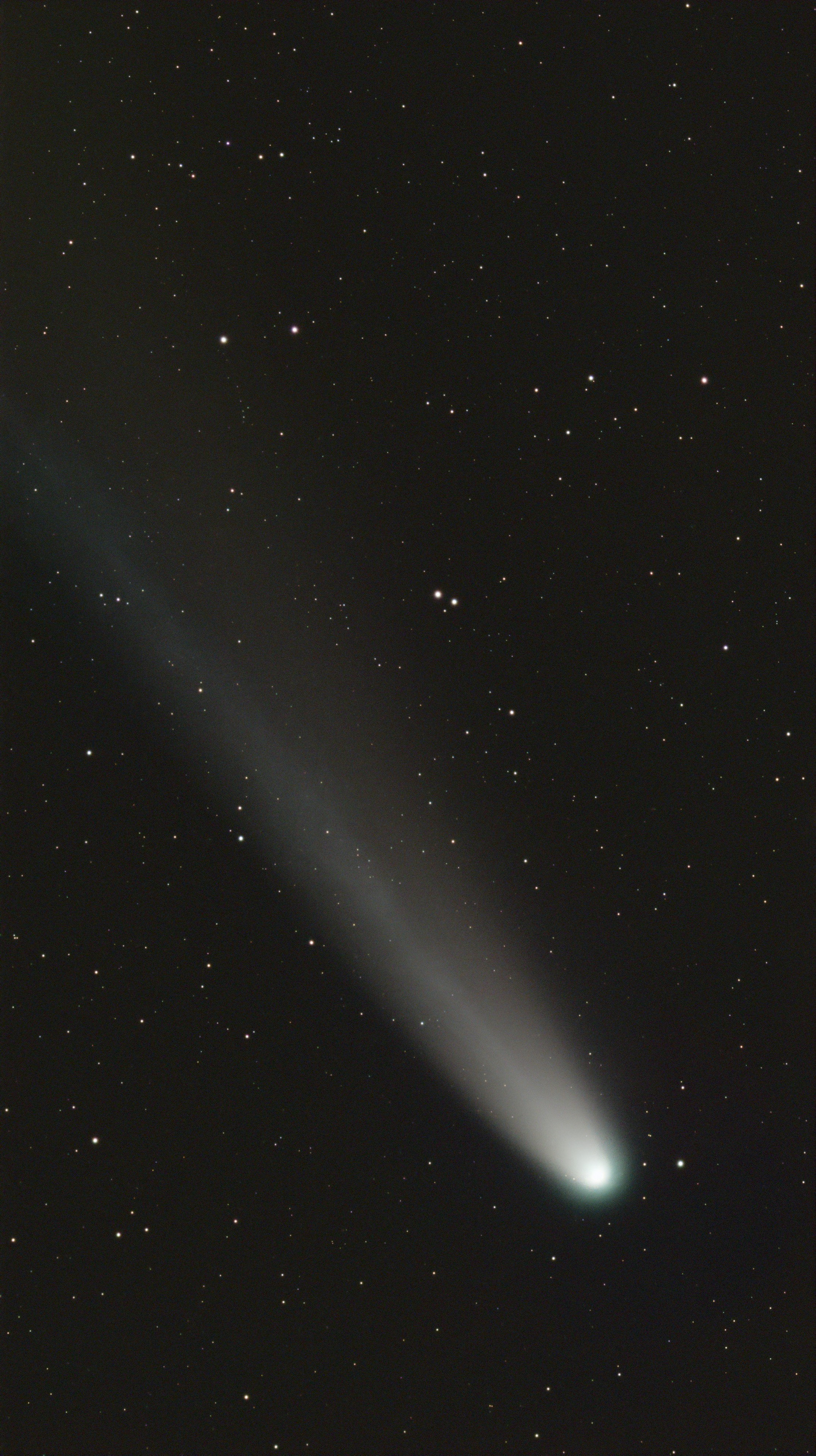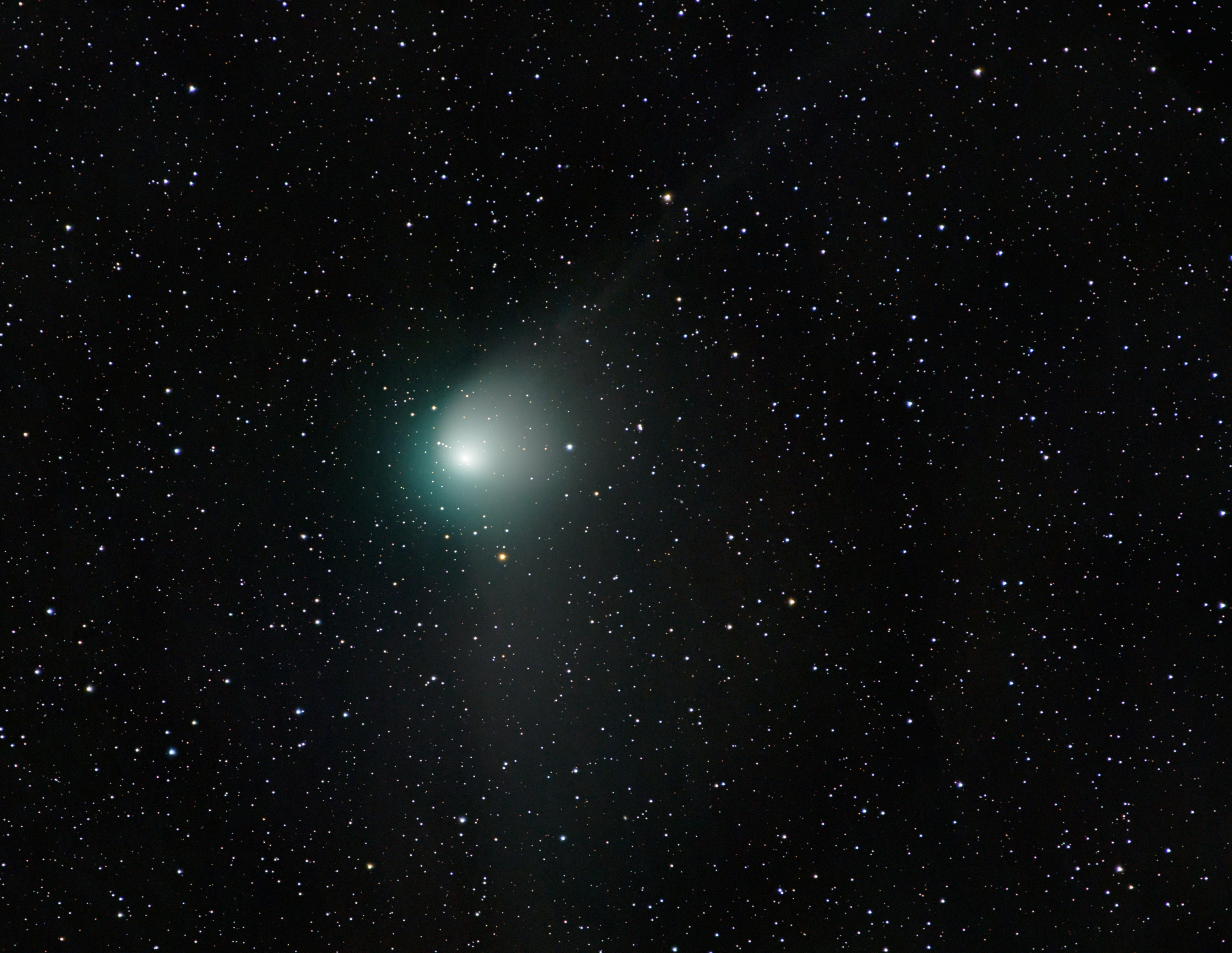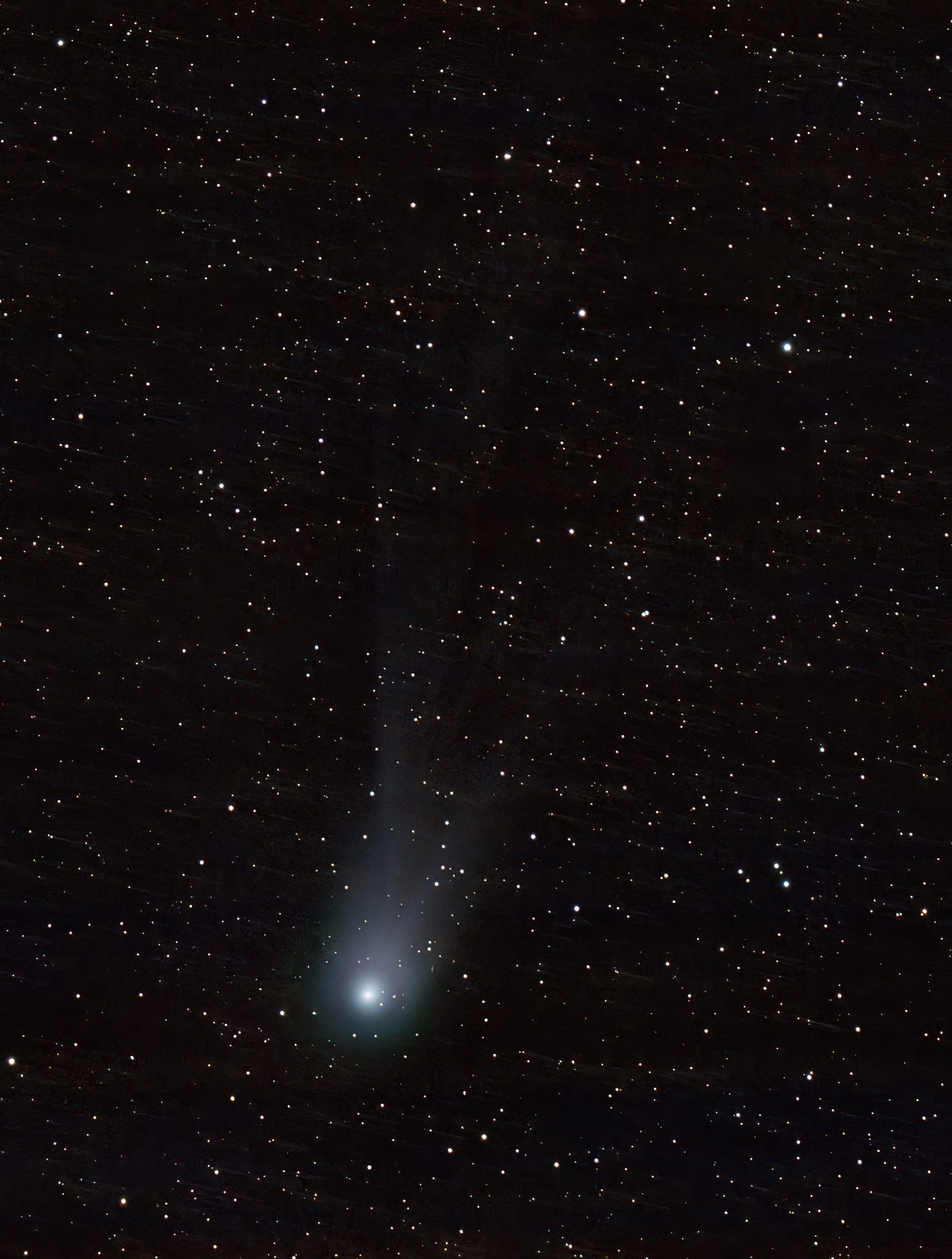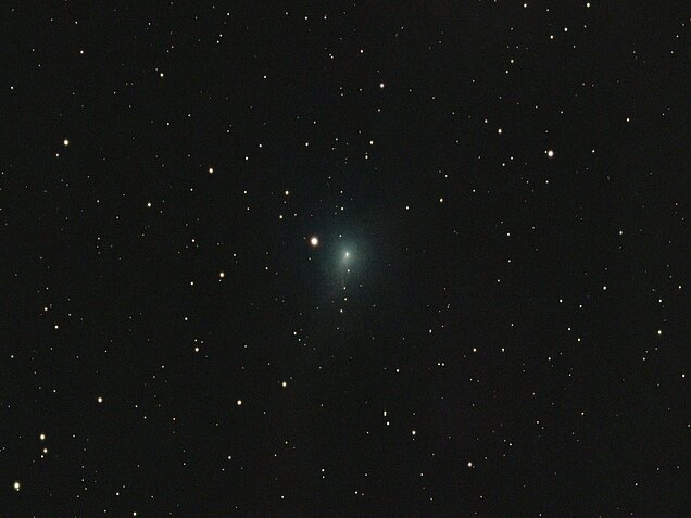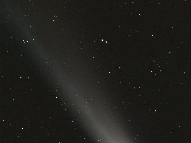 Anschließend trennt man die Sterne vom Kometen und stackt (addiert/überlagert) beide Komponenten gesondert. Ein normales Stacking, das sich an den Sternen orientiert, würde dazu führen, dass der Komet unschärfer wird bzw. auseinandergezogen erscheint.