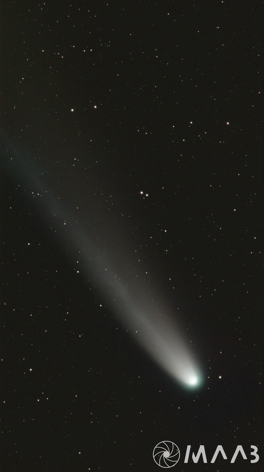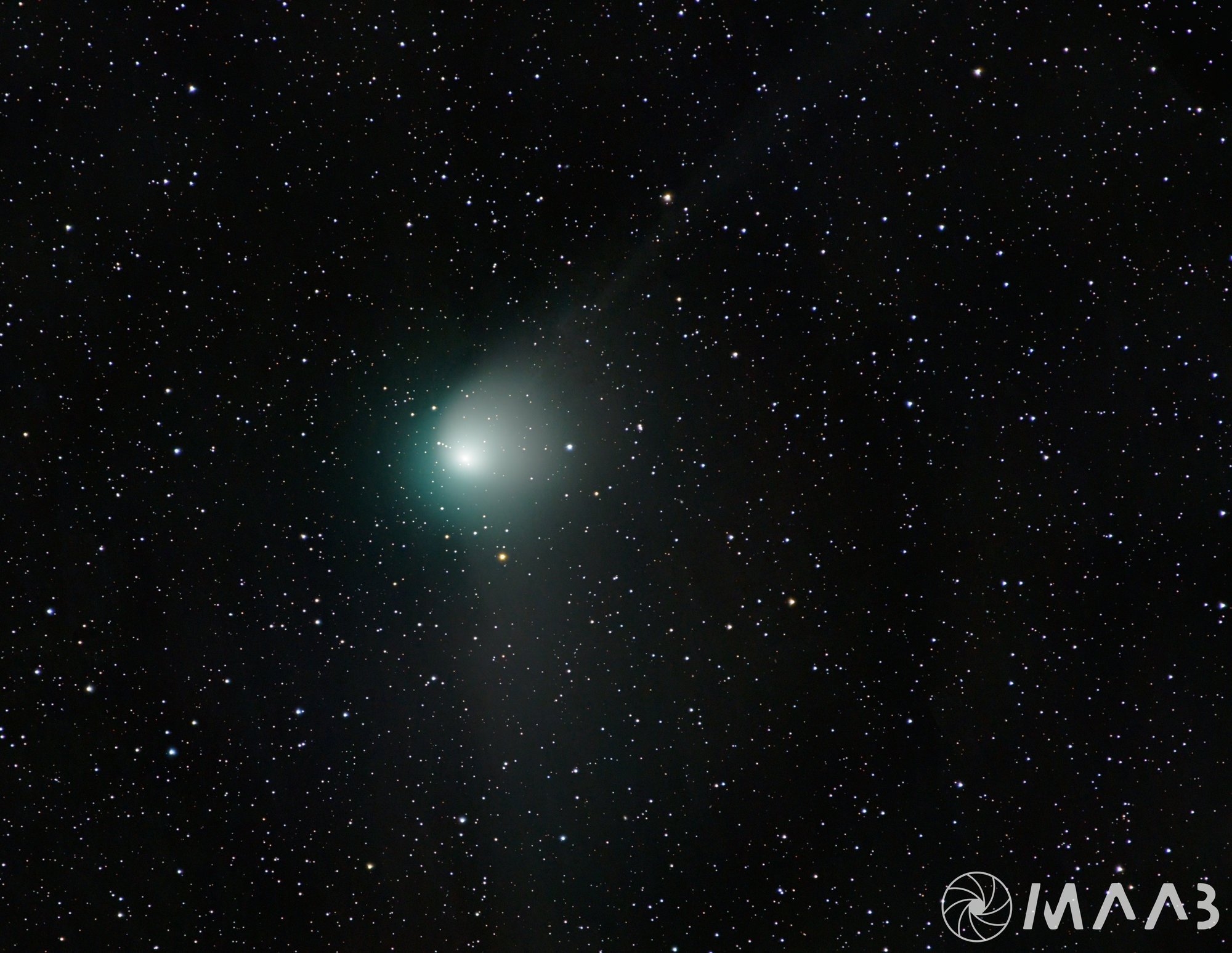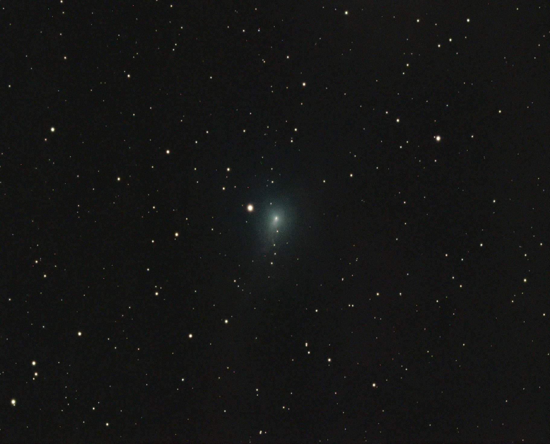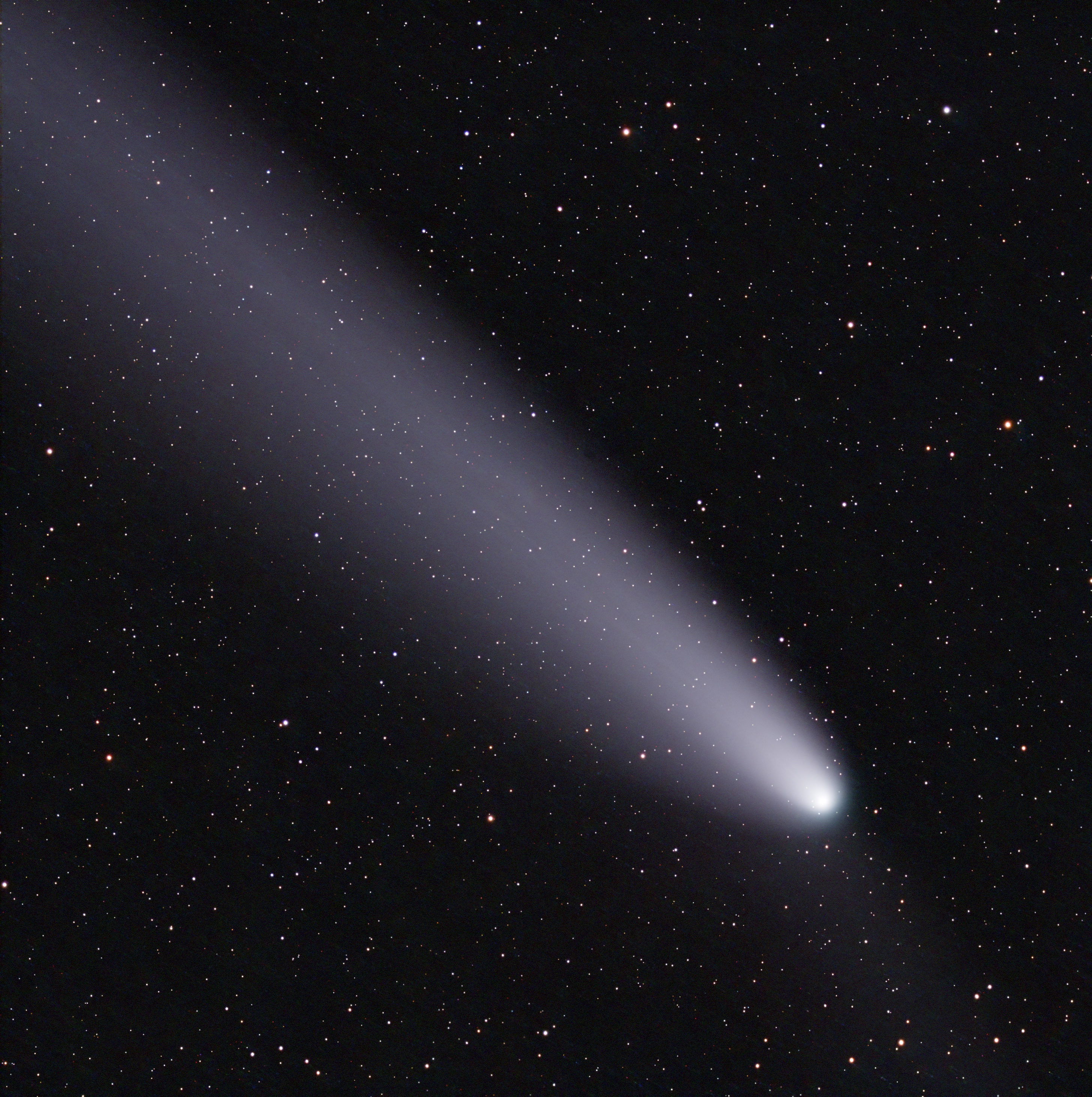 Anschließend trennt man die Sterne vom Kometen und stackt (addiert/überlagert) beide Komponenten gesondert. Ein normales Stacking, das sich an den Sternen orientiert, würde dazu führen, dass der Komet unschärfer wird bzw. auseinandergezogen erscheint.