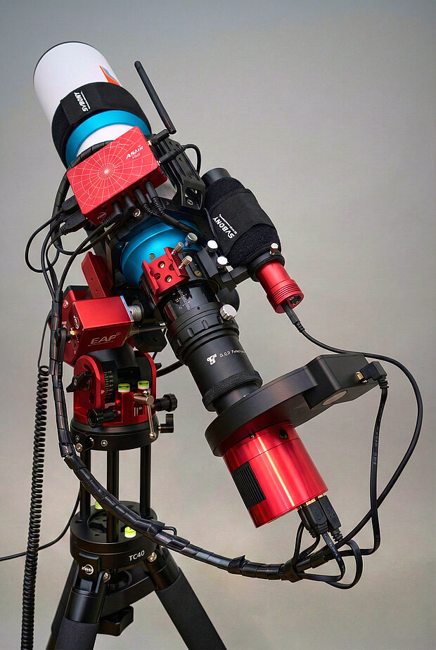 ZWO EAF (Electronic Automatic Focuser): Der rote Kasten, der seitlich am Teleskopauszug montiert ist (beschriftet mit "EAF"). Dieser Motor dreht den Fokusknopf des Teleskops automatisch, um gestochen scharfe Sterne zu erhalten, ohne dass man das Teleskop berühren muss. Fokussierung an Sternen funktioniert in der Regel bei einer normalen Kamera nicht. Dieser kann aber automatisch anhand der Sterngröße eine Kalibrierungskurve erstellen und dann ensprechend Fokussieren.